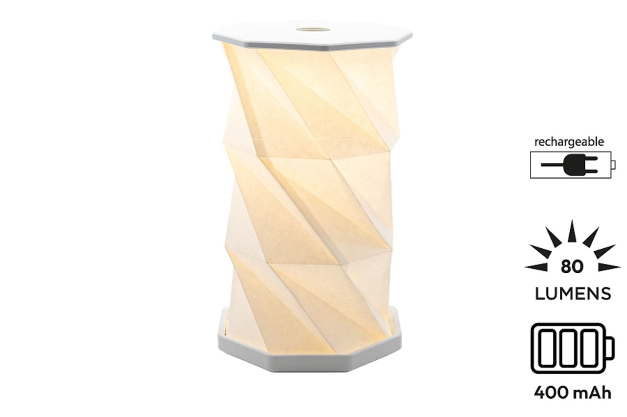 Gehäuse aus ABS und Innenkörper aus Papier mit geometrischem Muster, das an Origami erinnert. Automatisches Ein- und Ausschaltsystem durch Öffnen und Schließen der Lampe, aber auch manuell über einen Knopf an der Lampe bedienbar. Einstellbare Lichtintensität dank integriertem Dimmer. 3 verschiedene Beleuchtungsmodi. Maximale Höhe der Laterne ausgeklappt: 19 cm. Leistung der LED: 2,5W (80 Lumens). Funktioniert mit einem wiederaufladbaren 400-mAh-Akku. Akkulaufzeit: 2-4 Stunden. Wird mit einem USB-C-Ladekabel geliefert. Neue Version unseres 'Polaris'-Modells PLR000479.