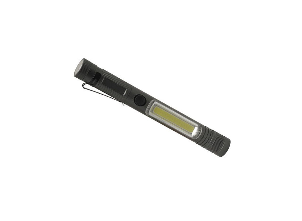 Griff aus eloxiertem Aluminium. 2 Funktionen: Taschenlampe (LED-Leistung: 1W-70 Lumens, Strahllänge: 10m) und Signallicht (COB-Leistung: 3W- 120 Lumens, Strahllänge: 5m). Zwei Beleuchtungsmodi zur Auswahl (kontinuierlich oder blinkend). Starker Magnet auf der Rückseite der Lampe. Dichtungen an jedem Gewinde für bessere Wasserdichtigkeit (nicht eintauchen). Ein- / Ausschaltknopf am Griff. Funktioniert mit 3 AAA-Batterien (im Lieferumfang enthalten). Wasserbeständigkeitsniveau: IPX-4.