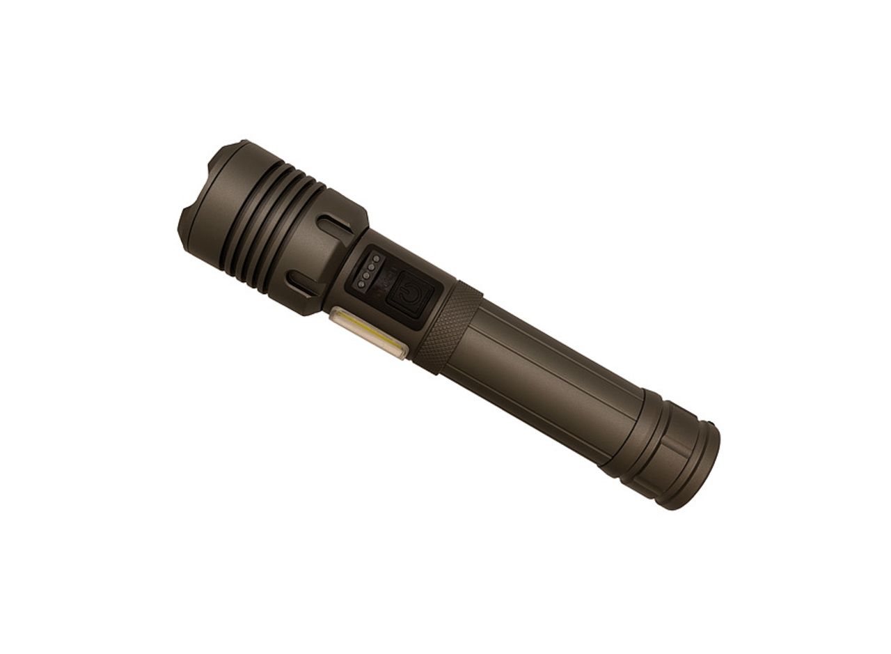 Griff aus eloxiertem Aluminium. 2 Funktionen: 5W LED-Taschenlampe (100 %, 30 % oder Blinklicht) und COB-Seitenlicht (100 %, 30 %, dauerhaft rot oder blinkend rot). Fokussiersystem zur Erhöhung der maximalen Leuchtweite durch Bündelung des Lichtstrahls. Ladeanzeige. Dichtungen an jedem Schraubgewinde für eine höhere Wasserbeständigkeit (nicht zum Eintauchen in Wasser geeignet). Ein-/Aus-Schalter an der Seite der Lampe und Handschlaufe am Ende des Griffs. Betrieb mit einem 1200 mAh-Akku. Volle Leistungslaufzeit: 2 Std. USB-A-/USB-C-Ladekabel im Lieferumfang enthalten. LED-Leistung: 5W (350 Lumen). Leuchtweite: 150 m.