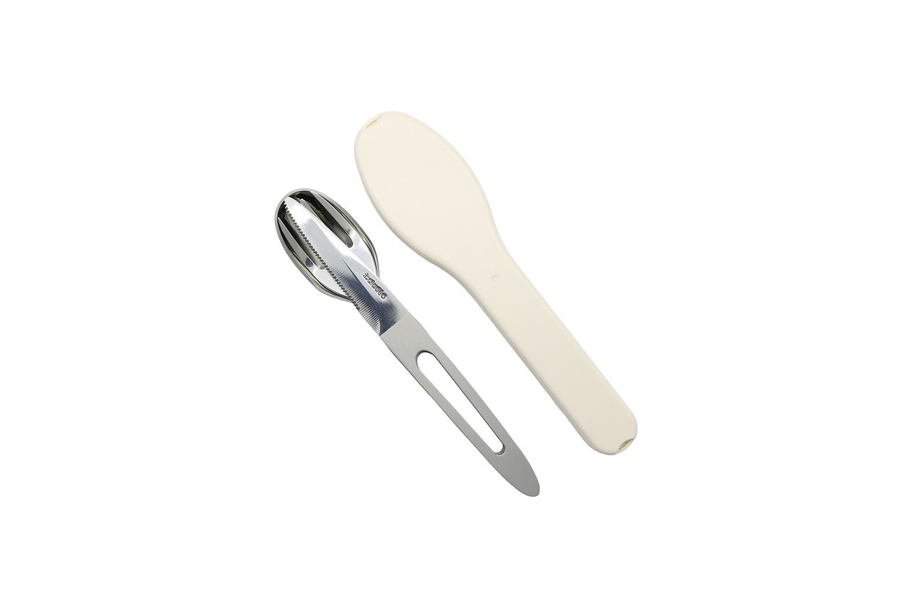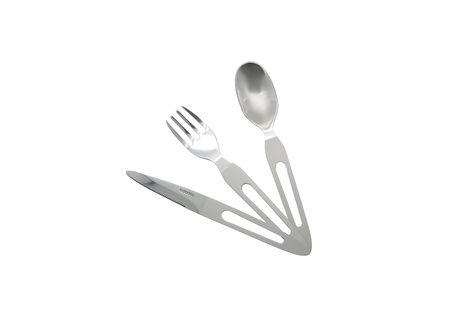 Besteckset aus 420er Edelstahl für den Lebensmittelgebrauch. 3 Funktionen: Messer mit Mikrozahnung, Gabel, Löffel. Spülmaschinenfestigkeit. Wird in einem ABS-Etui geliefert.