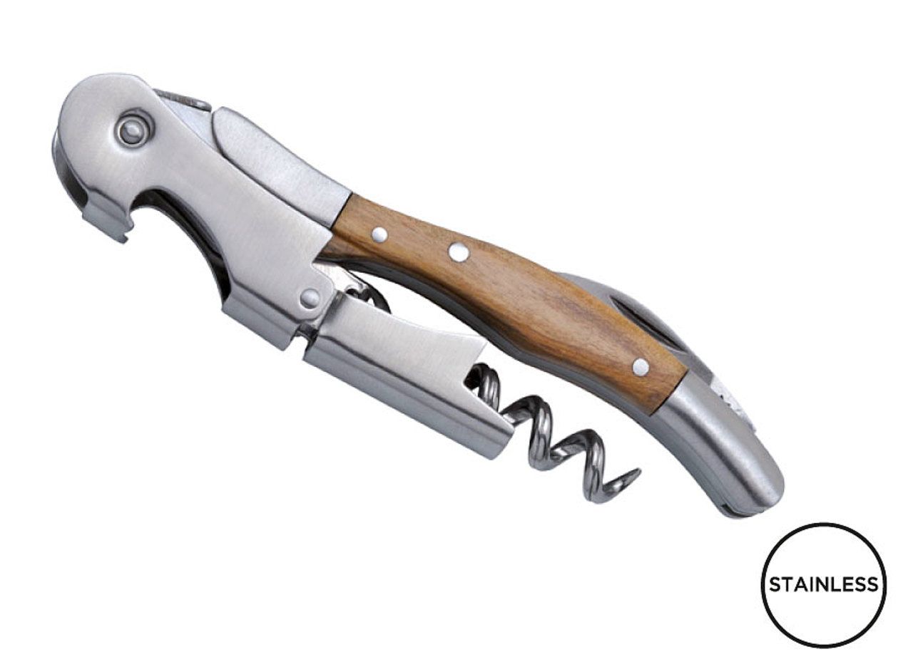 Professioneller Doppelhebel-Korkenzieher. Griff aus Olivenholz. Zwei geschmiedete Heftbacken aus rostfreiem Edelstahl. Korkenzieher-Spirale mit fünf Windungen aus Edelstahl, einer mikroverzahnten Kapselschneiderklinge und einem Flaschenöffner. Wird in einer schwarzen Geschenkbox geliefert.