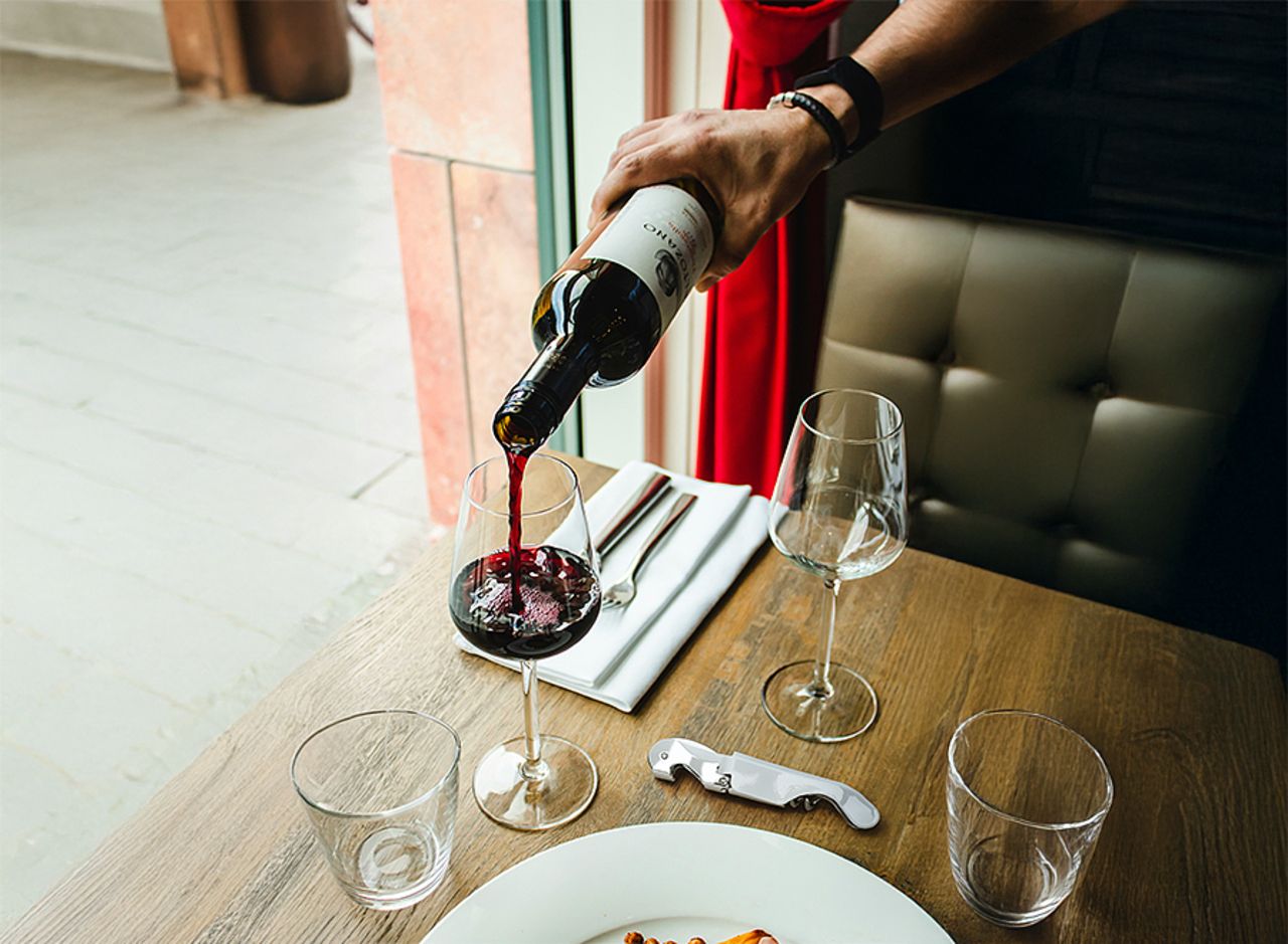 Professionelles Doppelhebel-Kellnermesser. Griff aus Edelstahl. Korkenzieher mit fünf Spiralen. Mikroverzahnte Kapselschneideklinge. Flaschenöffner.