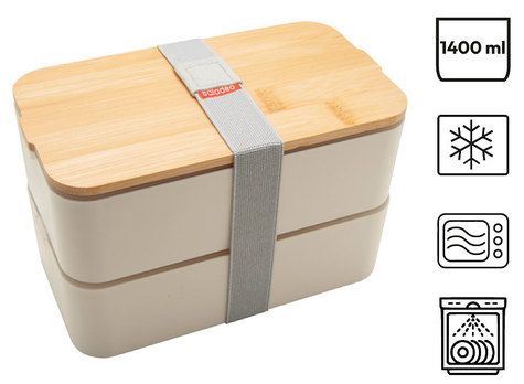 Lunchbox mit doppeltem Fach. Zwei Behälter aus Polypropylen und zwei Trennwände aus Polyethylen mit Silikondichtungen und Vakuumverschlusssystem für perfekte Abdichtung. Deckel aus Bambus. Kompatibel (ohne Deckel) mit Spülmaschine (max. 50 °C), Gefrierschrank und Mikrowelle (max. 100 °C und 2 Minuten). Fassungsvermögen: 1,4 L.