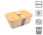Lunchbox mit einem Fach. Behälter aus Polypropylen. Bambusdeckel mit Silikondichtungen für eine bessere Abdichtung. Kompatibel (ohne Deckel) mit Spülmaschine (max. 50 °C), Gefrierschrank und Mikrowelle (ohne Deckel, max. 100° C und 2 Minuten). Fassungsvermögen: 1 L.