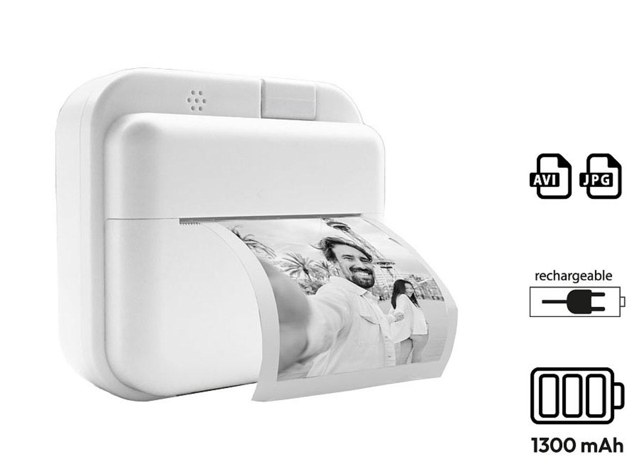 Instantkamera mit ABS Gehäuse, welches das Aufnehmen von Farbfotos im JPG-Format (auflösbar zwischen 12, 20 oder 48 MP), das Aufzeichnen von Videos im AVI-Format (Auflösung 1080P) und den sofortigen Thermodruck in Schwarzweiß ohne Toner ermöglicht. Bildschirmgröße: 5 cm (2"). Funktionen: Timer (3, 5 oder 10 Sekunden) und Serienaufnahmen. 10 Filter und 10 Rahmen verfügbar. Einstellbare Frequenz: 50 oder 60 Hz. 2 Rollen Thermopapier im Lieferumfang enthalten, jede reicht für den Druck von 50 Fotos. Navigationsmenü in 15 Sprachen verfügbar, darunter Französisch, Englisch und Deutsch. 5 Minispiele. Funktioniert mit einem wiederaufladbaren 1300-mAh-Akku. Wird mit einem USB-C-Ladekabel geliefert.