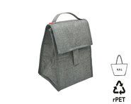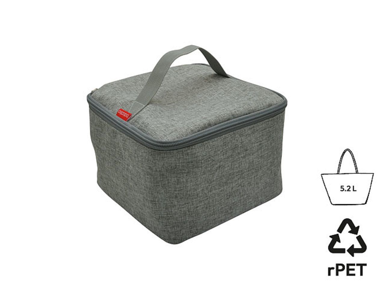 Thermotasche aus grau meliertem RPET - Wulongstoff. Kompatibel mit allen unseren Bento-Modellen. Isolierende 3mm dicke Auskleidung. Verstärkter Griff. Reißverschluss. Fassungsvermögen: 5,2 L.
