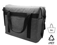 Thermokühlbox aus grau meliertem Wulongstoff. Isolierende 5mm dicke Ausführung. Vordertasche und Aufbewahrungsnetz auf einer Seite. Griffe und verstellbarer Tragegurt vorhanden. Reißverschluss mit Flaschenöffner aus Aluminium. Fassungsvermögen: 15 L.
