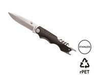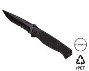 Klappbares Messer mit Klinge aus rostfreiem 420er Edelstahl, bestehend aus einem feinen Teil der Klinge (für präzise Schnitte) und einem teilweise gezahnten Teil (für schwierigere Schnitte). Der Griff besteht aus rostfreiem Edelstahl, der mit schwarzer Gummibeschichtung überzogen ist. Einhändiges Öffnen/ Schließen mit einem Liner Lock Sicherheitsmechanismus. Gürtelclip aus Edelstahl.