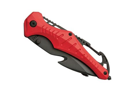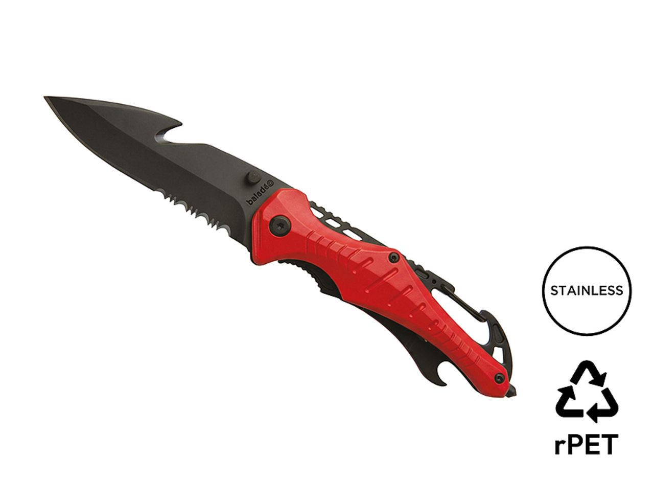 Klappbares Messer mit Klinge aus rostfreiem 420er Edelstahl und Titanbeschichtung, bestehend aus einem feinen Teil der Klinge (für präzise Schnitte) und einem teilweise gezahnten Teil (für schwierigere Schnitte). Montage mit Torx Schrauben. Griff aus rot eloxiertem Aluminium. Einhändiges Öffnen/ Schließen mit einem Liner-Lock-Sicherheitsmechanismus. Gürtelclip. Funktionen wie Gurtschneider/ Seilschneider, Wolframkarbid-Glasbrecher und Flaschenöffner. Wird in einem melierten grauen Etui aus RPET geliefert.