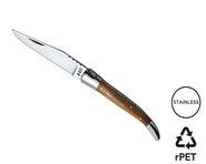Klappbares Messer mit Klinge aus rostfreiem 420er Edelstahl. Griff aus Zebranoholz. Verzierte Feder. Eine geschmiedete Heftbacke aus rostfreiem Edelstahl. Wird mit einem melierten grauen Etui aus 420D-Nylon geliefert.