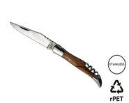Klappbares Messer mit Klinge aus rostfreiem 420er Edelstahl. Griff aus Olivenholz. Korkenzieher mit 5-Spiralen. Messerschließung durch Zwangsfeder. Wird in einem melierten grauen Etui aus RPET geliefert.