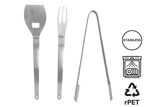 3-teiliges Grillbesteckset aus 430er Edelstahl (ferritisch gemäß Dekret vom 13. Januar 1976) für den Lebensmittelgebrauch mit Zange, Spatel und Gabel. Länge: 34,50 cm. Spülmaschinenfestigkeit. Wird in einer graumelierten RPET-Rolltasche geliefert.