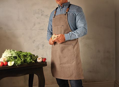 Schürze aus schwerem Baumwollstoff (450 g/m²). Beigefarbene Ziernähte. Nieten, Ösen und Haken aus Metall. Polyesterträger mit Besätzen aus Kunstleder. 4 Aufbewahrungstaschen (1 mit 12 cm Tiefe und 10 cm Breite / 3 mit 21 cm Tiefe und Breiten von 8, 8 und 17 cm).
