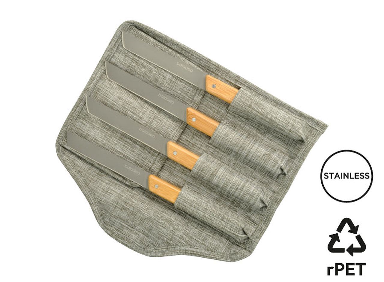 Set aus 4 Messern mit Klingenlänge von 10 cm. Klingen aus 420er Edelstahl für den Lebensmittelgebrauch (martensitischer Stahl gemäß EN10088-2 2005) und Titan-Finish. Griffe aus Bambus. Wird mit einer melierten grauen Rolltasche aus recyceltem RPET geliefert.
