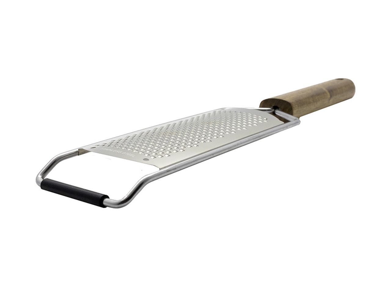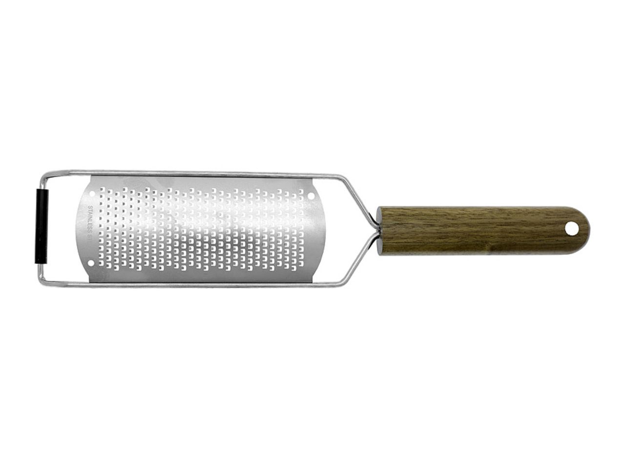 Reibefläche: 11 x 4,5 cm bei einer Dicke von 0,8 mm. Hergestellt aus lebensmittelechtem Edelstahl 304. Griff aus Akazienholz mit einem Rahmen aus Edelstahl 430. Schutzabdeckung aus Polypropylen und rutschfestem TPR.