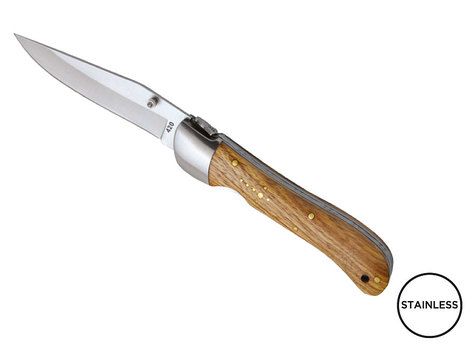 Couteau pliant avec lame en acier inoxydable 420. Manche en frêne exotique. Ressort guilloché. Mitre forgée en acier brossé inoxydable. Ouverture/fermeture une main avec cran de sécurité de type Liner lock. Livré dans un étui de ceinture en nylon 420D gris chiné.