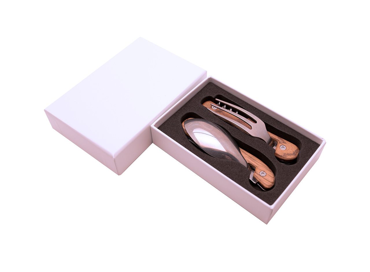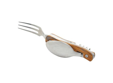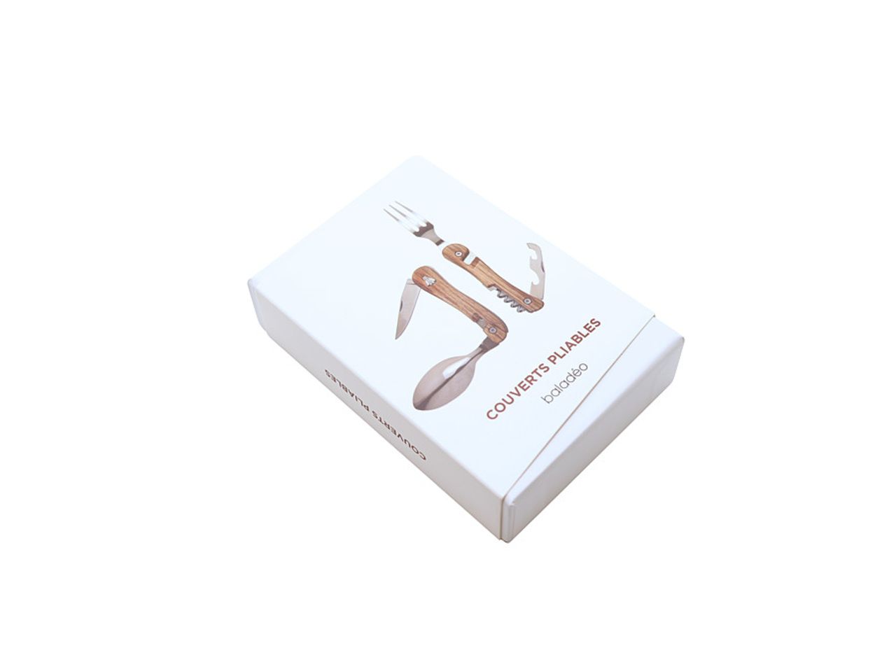 Couverts de voyage pliants en acier inoxydable 420 alimentaire. Manche en frêne exotique. Assemblage aimanté pour scinder le produit en deux parties et former ainsi une fourchette et un couteau (ou une cuillère). 6 fonctions : couteau, fourchette, cuillère, décapsuleur, ouvre boite, tire-bouchon avec mèche 4 spirales en acier inoxydable. Livrés dans un coffret cadeau en carton blanc.