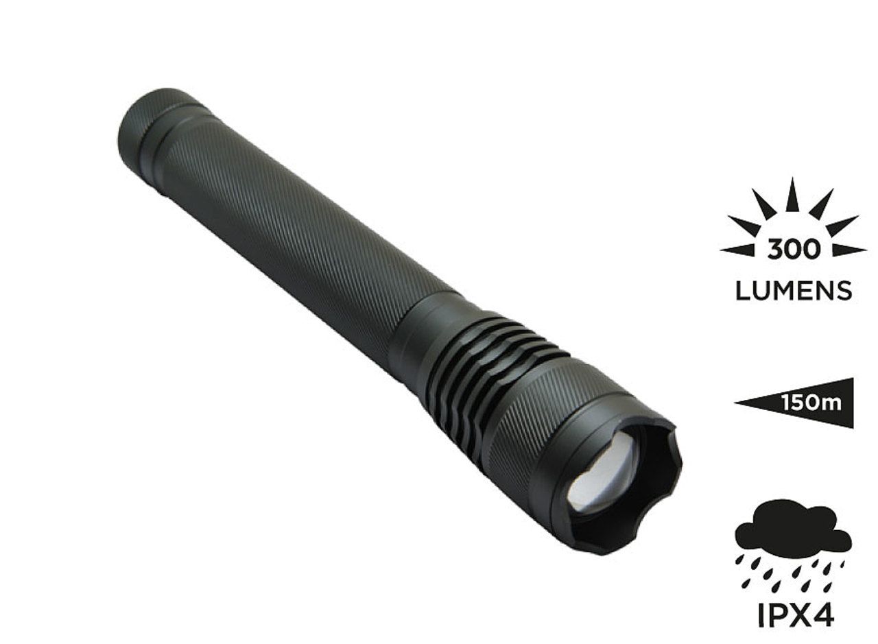 Manche en aluminium anodisé. LED 5W CREE XPE. 3 modes d'éclairage (100%, 30% ou clignotant). Système de focus permettant d'augmenter la distance maximum d'éclairage en concentrant le faisceau. Joints sur chaque pas de vis pour une meilleure étanchéité (ne pas immerger). Bouton on / off au talon de la lampe. Fonctionne avec 3 piles LR14 C (non fournies). Puissance de la LED : 5W (300 lumens). Longueur du faisceau : 150m. Niveau d'étanchéité : IPX-4. Livrée dans un coffret cadeau en carton.