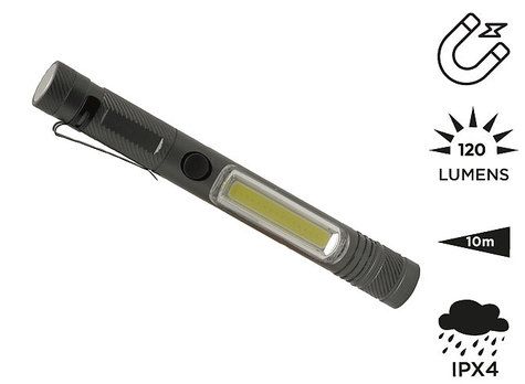 Manche en aluminium anodisé. 2 fonctions : Lampe torche (Puissance de la LED : 1W (70 lumens). Longueur du faisceau : 10 m) et lampe de signalisation (Puissance des COB : 3W (120 lumens). Longueur du faisceau : 5m). 2 modes d'éclairage aux choix (Continu ou clignotant). Puissant aimant à l'arrière de la lampe. Joints sur chaque pas de vis pour une meilleure étanchéité (ne pas immerger). Bouton on / off sur le manche. Fonctionne avec 3 piles AAA (fournies). Niveau d'étanchéité : IPX-4.