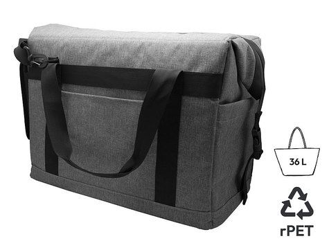 Glacière isotherme en tissu wulong gris chiné RPET. Finition isolante de 5mm d'épaisseur. Poche ventrale et espaces de rangement de chaque côté. Ouverture large avec clips latéraux de maintien. Poignées et bandoulière asymétrique réglable, chacune matelassée. Fermeture éclair étanchéifiée. Structure renforcée sous le sac. Contenance : 36 L.