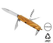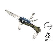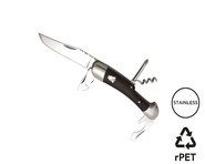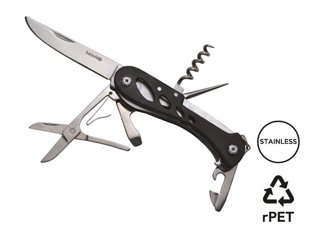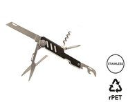 Eléments entièrement en acier inoxydable hautement résistant (2CR13). Manche en aluminium touché gomme. 9 fonctions : couteau avec cran de sécurité de type Liner lock, décapsuleur, ouvre boite avec cran de sécurité de type Liner lock, ciseaux, tournevis plat 5 mm et 2 mm, tire-bouchon avec mèche 4 spirales, poinçon, anneau. Livré dans un étui gris chiné en RPET.
