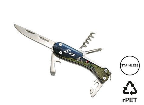 Eléments entièrement en acier inoxydable hautement résistant (2CR13). Manche en plastique transparent. Assemblage vissé Torx. 7 fonctions : couteau, décapsuleur, ouvre boite, tournevis cruciforme, tournevis plat 4 mm et 2 mm, tire-bouchon avec mèche 4 spirales, anneau. Livré dans un étui gris chiné en RPET.