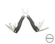 Pince multifonctions professionnelle en acier inoxydable hautement résistant (2CR13). Manche en acier inoxydable. Blocage de sécurité nouvelle génération (déblocage facile). Assemblage vissé Torx. 12 fonctions : pince universelle, pince coupante, couteau, scie, lime, décapsuleur, ouvre boîte, tournevis cruciforme, 3 tailles de tournevis plat, poinçon. Dureté rockwell : 48 degrés. Livrée dans un étui de ceinture en nylon noir.
