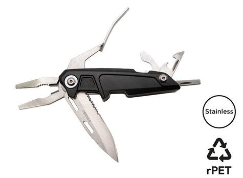 Outil multifonctions professionnel en acier inoxydable hautement résistant (2CR13). Manche en aluminium. Assemblage vissé Torx. 17 fonctions : pince, pince coupante, couteau, décapsuleur, ouvre-boîte, 2 tailles de tournevis plat, assortiment de 9 outils (tournevis cruciformes, plats, clés Allen), dénudeur. Dureté rockwell : 48 degrés. Livré dans un étui gris chiné en RPET.