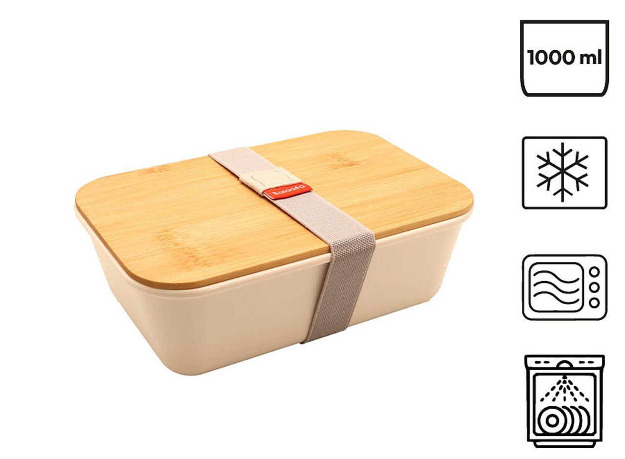 Boîte déjeuner (lunch box) simple compartiment. Contenant en polypropylène. Couvercle en bambou avec joints en silicone pour une meilleure étanchéité. Compatible (sans le couvercle) avec lave-vaisselle (50° max), congélateur et micro-ondes (Sans le couvercle à 100° et 2 minutes max). Contenance : 1 L.