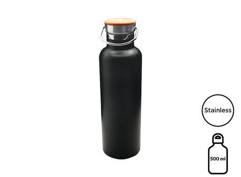 Double paroi isotherme en acier inoxydable 18/8 conforme aux normes de contact alimentaire. Bouchon vissé en bambou avec une poignée intégrée en acier et un joint en silicone. Contenance : 500 ml.