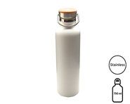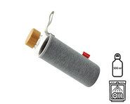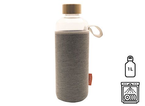 Verre borosilicate simple paroi. Bouchon vissé en bambou avec un joint en silicone. Compatible (sans le bouchon) avec lave-vaisselle. Housse de protection en néoprène gris chiné. Contenance : 1 L.