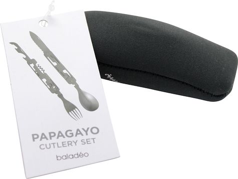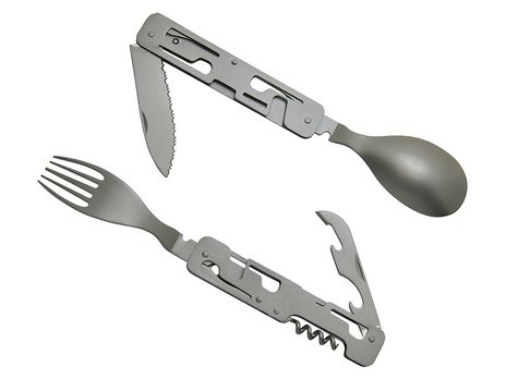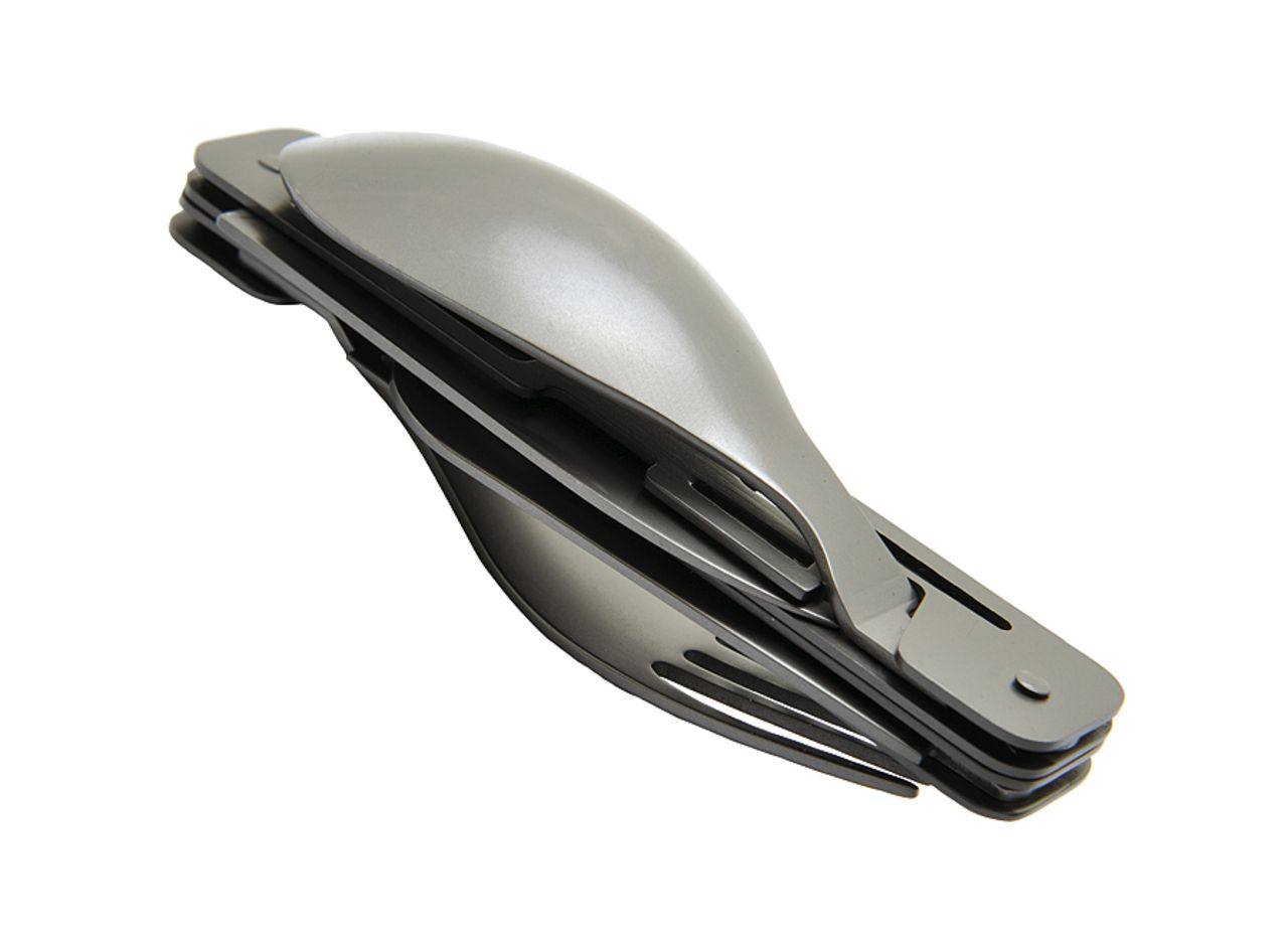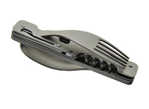 Couverts de voyage pliants en acier inoxydable 420 alimentaire avec revêtement titane. Assemblage astucieux pour scinder le produit en deux parties et former ainsi une fourchette et un couteau (ou une cuillère). 6 fonctions : couteau avec lame microdentée, fourchette, cuillère, décapsuleur, ouvre boite, tire-bouchon avec mèche 4 spirales en acier inoxydable. Livrés dans une housse en néoprène gris anthracite.