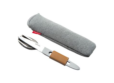 Couverts de voyage en acier inoxydable 420 alimentaire. 3 fonctions : couteau avec lame microdentée, fourchette, cuillère. Passe au lave-vaisselle. Livrés avec un fourreau de maintien en similicuir dans une housse en néoprène gris anthracite.