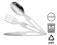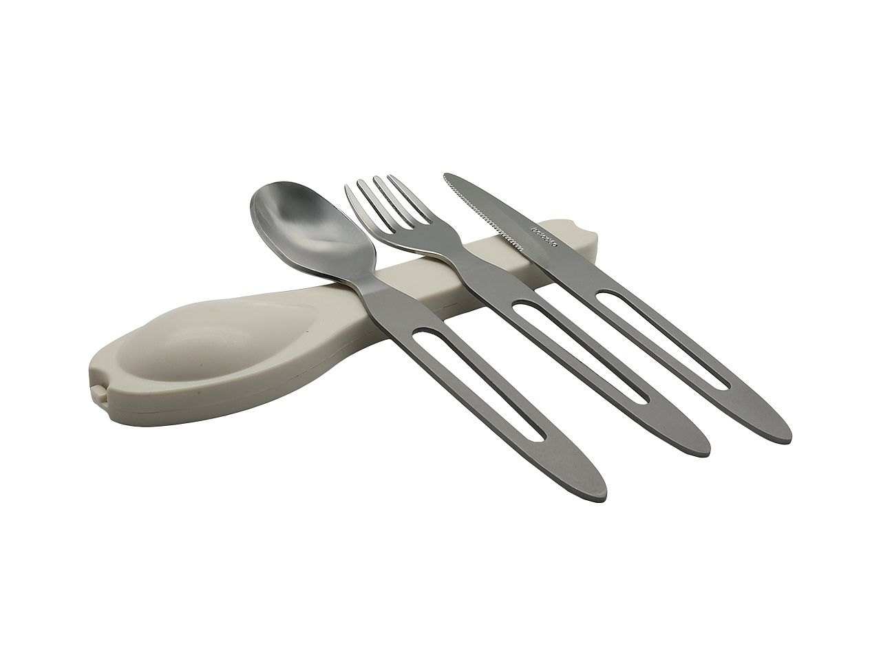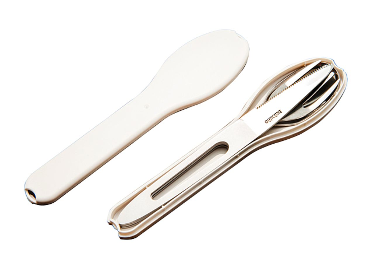 Couverts de voyage en acier inoxydable 420 alimentaire. 3 fonctions : couteau avec lame microdentée, fourchette, cuillère. Passe au lave-vaisselle. Livrés dans un étui de rangement blanc en ABS.
