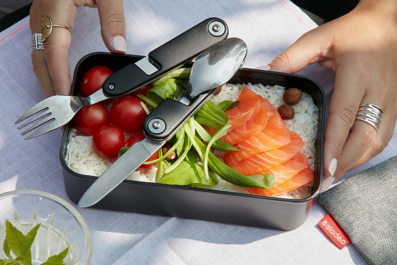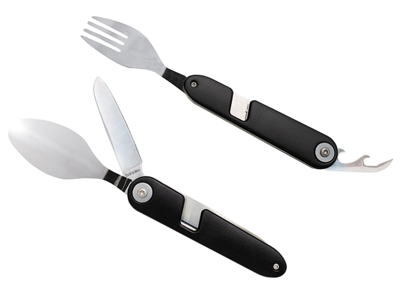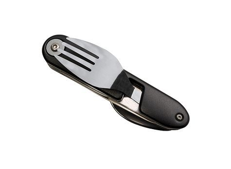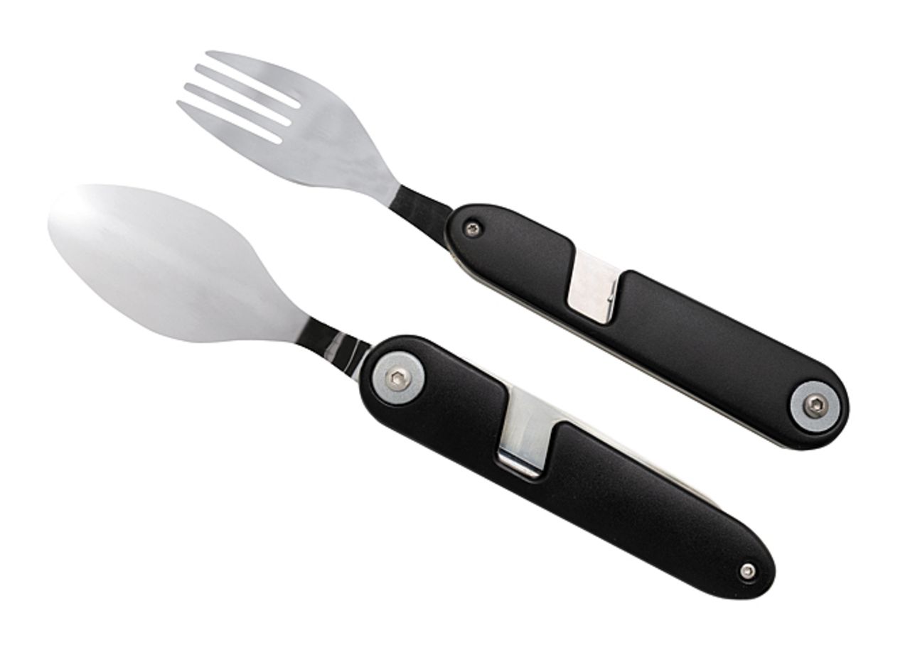 Couverts de voyage pliants en acier inoxydable 420 alimentaire. Manche en aluminium. Assemblage aimanté pour scinder le produit en deux parties et former ainsi une fourchette et un couteau (ou une cuillère). 5 fonctions : couteau, fourchette, cuillère, décapsuleur, ouvre-boite. Livré dans un étui gris chiné en RPET.