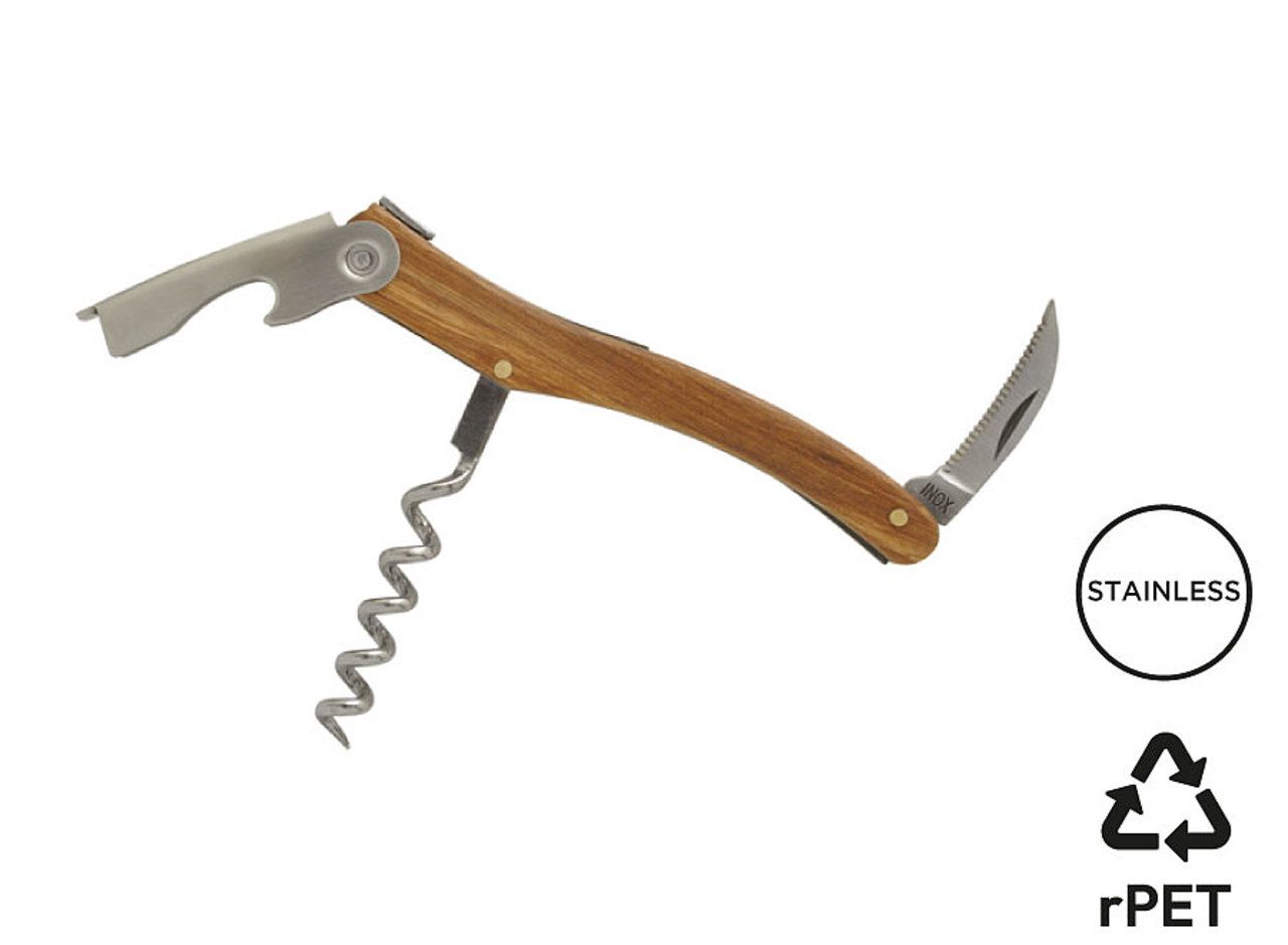 Tire-bouchon professionnel. Manche en frêne exotique. Mèche 5 spirales en acier inoxydable. Lame coupe-collerette microdentée. Décapsuleur. Livré dans un étui gris chiné en RPET.