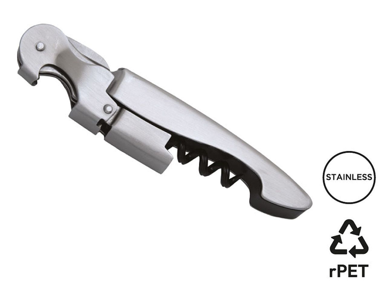 Tire-bouchon professionnel double levier. Entièrement en acier inoxydable. Mèche 5 spirales avec revêtement anti-adhérent noir. Lame coupe collerette microdentée. Décapsuleur rapide. Livré dans un étui gris chiné en RPET.