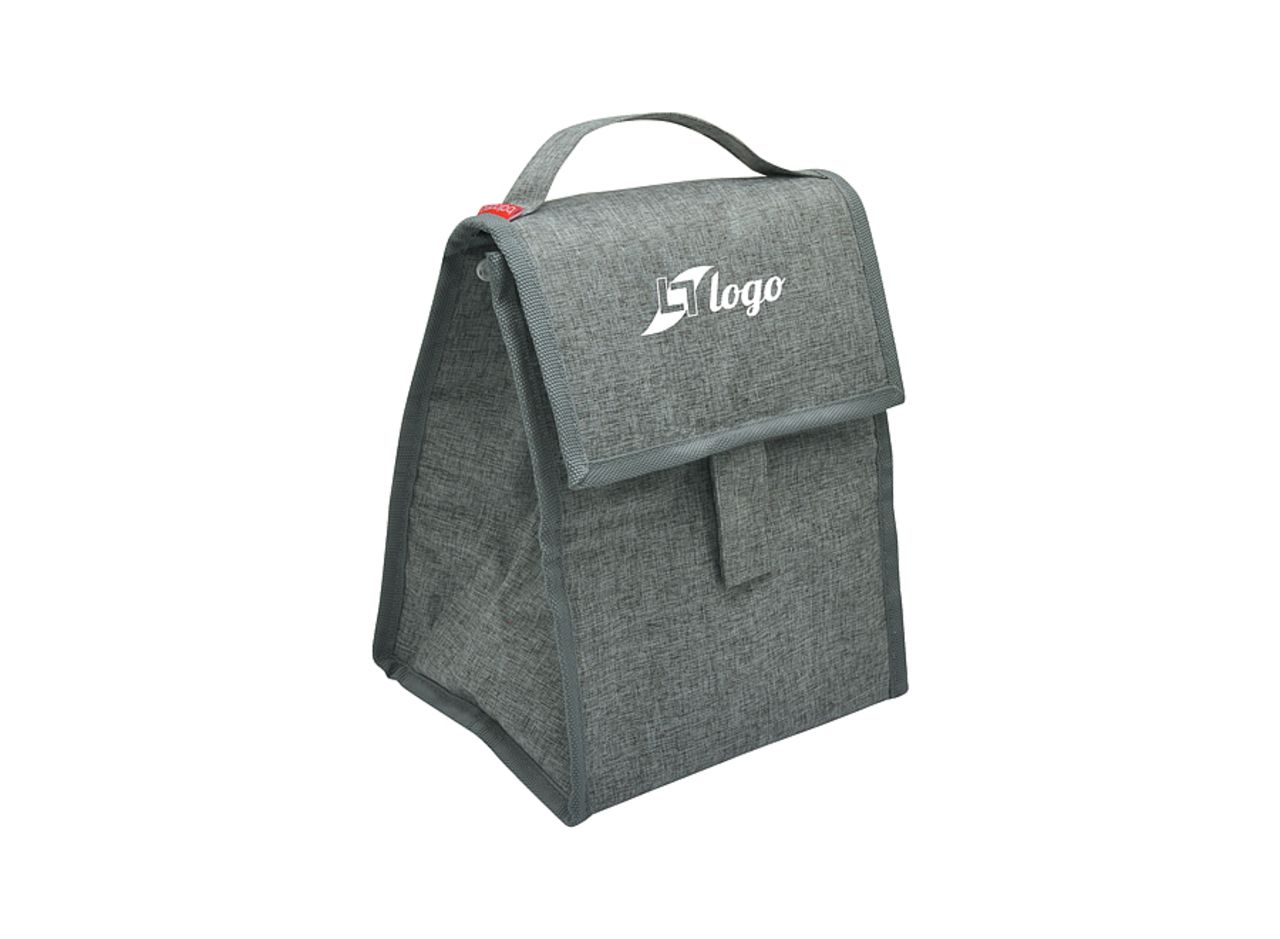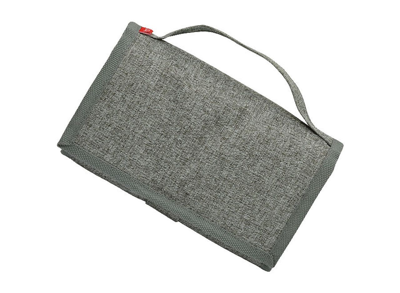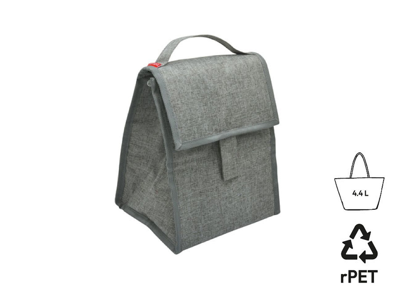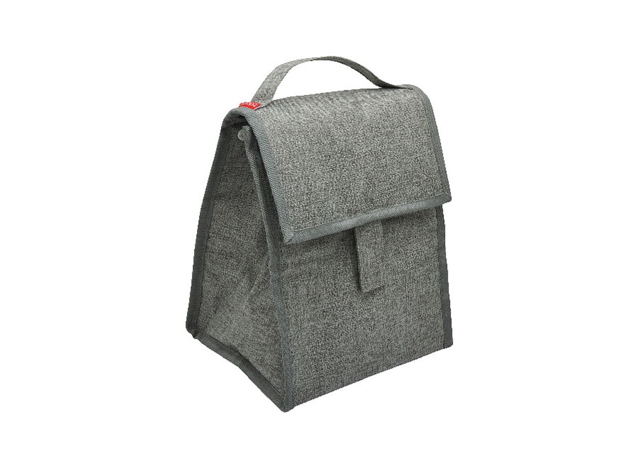 Ultra-compact foldable insulated bag in heather grey wulong RPET fabric. Suitable for all our bento models. 2mm thick insulation covered with aluminium foil. Internal mesh pocket. Reinforced handle. Snap button + velcro closure. Capacity: 4,4 L.