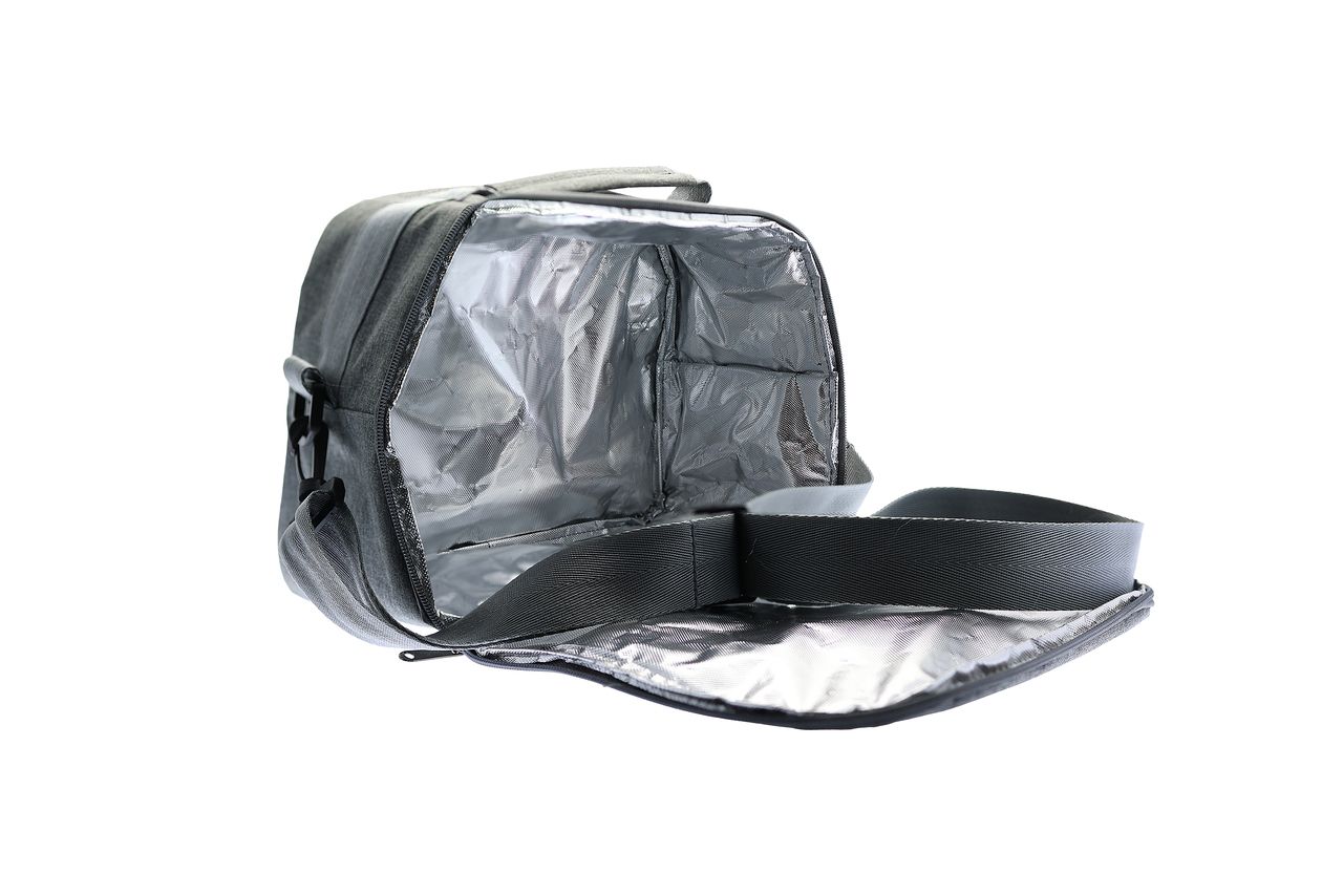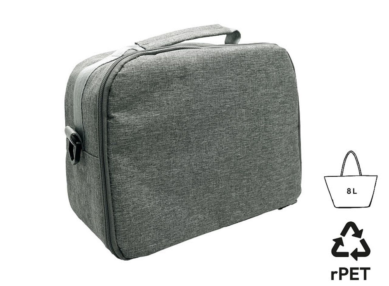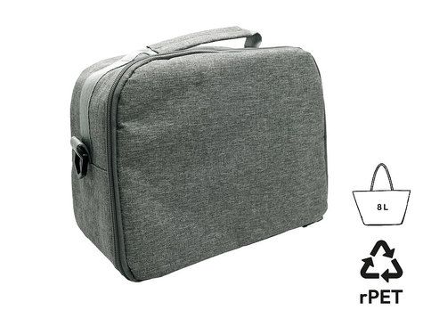 Insulated bag in heather grey RPET fabric. Suitable for all our bento models. 3mm thick insulation. Shoulder strap. Possibility to insert a business card. Reinforced and padded handle for a better grip. Zipped closure. Capacity: 8 L.