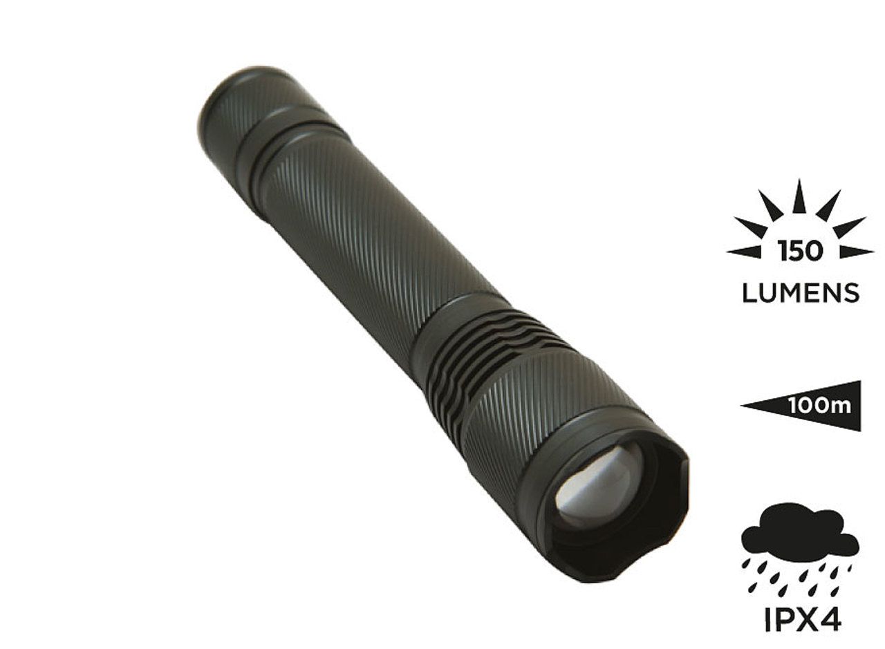 Anodized aluminium handle. 3W LED. Focus system allowing to increase the maximum beam distance by concentrating it. Seals on each screw thread for a higher waterproof level (do not immerse). On/Off button at the back of the lamp. Works with 2 LR06 AA batteries (included). LED power: 3W (150 lumens). Beam distance: 100m. Waterproof level: IPX-4. Delivered in a carton gift box.