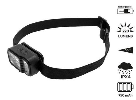 4 lighting modes: XPG LED (100% or 'Eco' mode), LED SMD (Warm light), or flashing red LED. Built-in motion sensor for contactless On/Off operations. Charging indicator in %. Adjustable lighting beam. ABS plastic case. Comfortable elastic band in soft touch. Works with a 750mAh rechargeable battery. USB-C charging cable included. XPG LED power: 5W (220 lumens). XPG LED beam distance: 50m. XPG LED autonomy: 2-4h. Waterproof level: IPX-4.