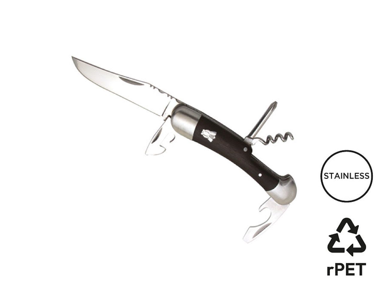 Elements entirely made of highly resistant stainless steel (2CR13). Black stamina handle. 2 stainless steel forged bolsters. Traditional tangstamping. 7 functions: knife, bottle opener, can opener, cross-head screwdriver, 2 flat screwdrivers, stainless steel corkscrew. Heather grey RPET pouch included.