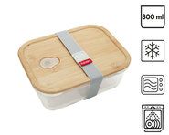 Single compartment lunch box. Polypropylene container and polyethylene separator with silicone seals and vacuum system for a perfect sealing. Polypropylene compartment tray. Bamboo lid. Without the lid, dishwasher safe (max 50°C), freezer safe and microwave safe (max 100°C and 2 minutes). Capacity: 1,75 L.