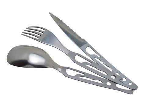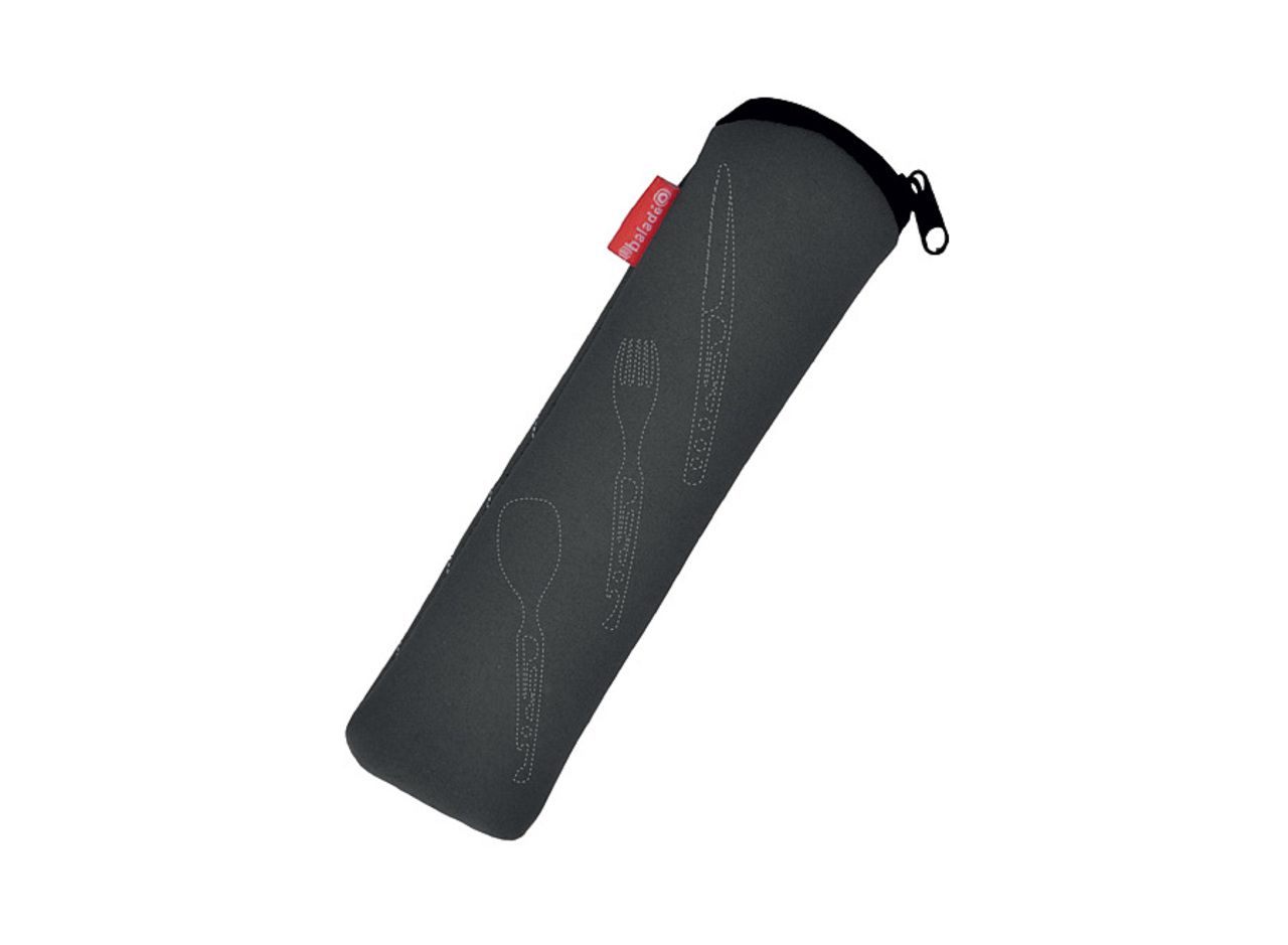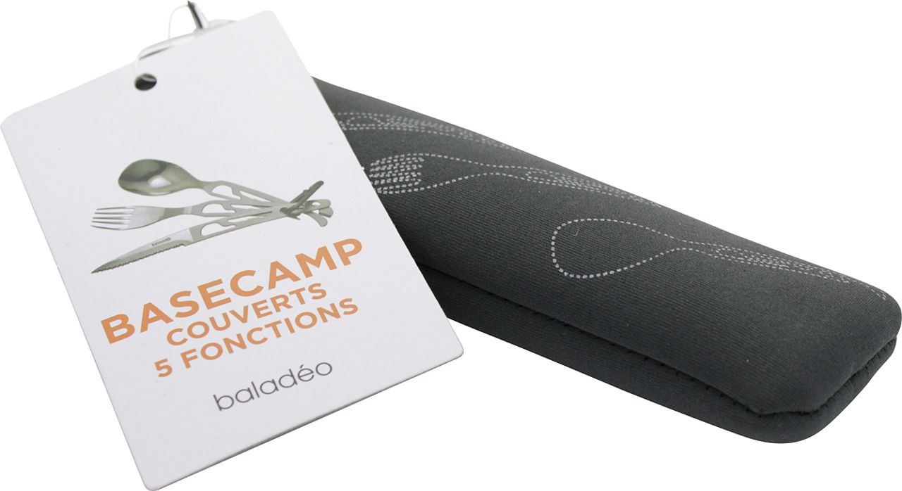Food-grade 420 stainless steel travel cutlery set. 5 functions: micro-serrated blade knife, fork, spoon, bottle opener, can opener. Dishwasher safe. Aluminium carabiner and anthracite grey neoprene pouch included.