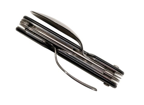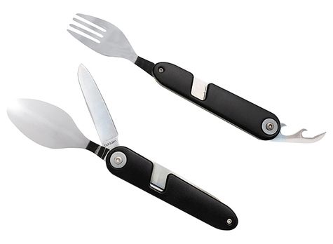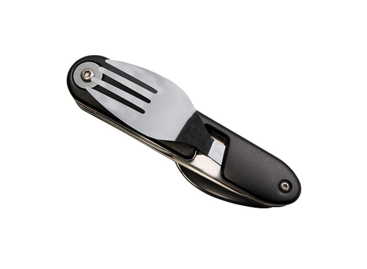 Food-grade 420 stainless steel folding travel cutlery set. Aluminium handle. Magnetic system to split the product into two parts and form a fork and a knife (or a spoon). 5 functions: knife, fork, spoon, bottle opener, can opener. Heather grey RPET pouch included.