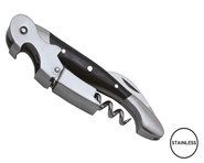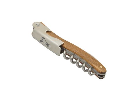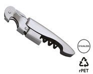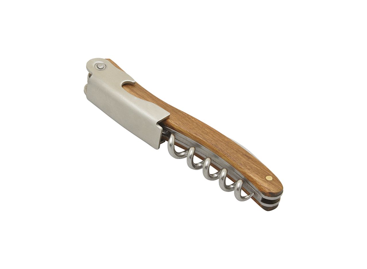 Professional sommelier corkscrew. Zebrawood handle. 5 spirals stainless steel corkscrew end. Micro-serrated lid cutter. Bottle opener. Heather grey RPET pouch included.