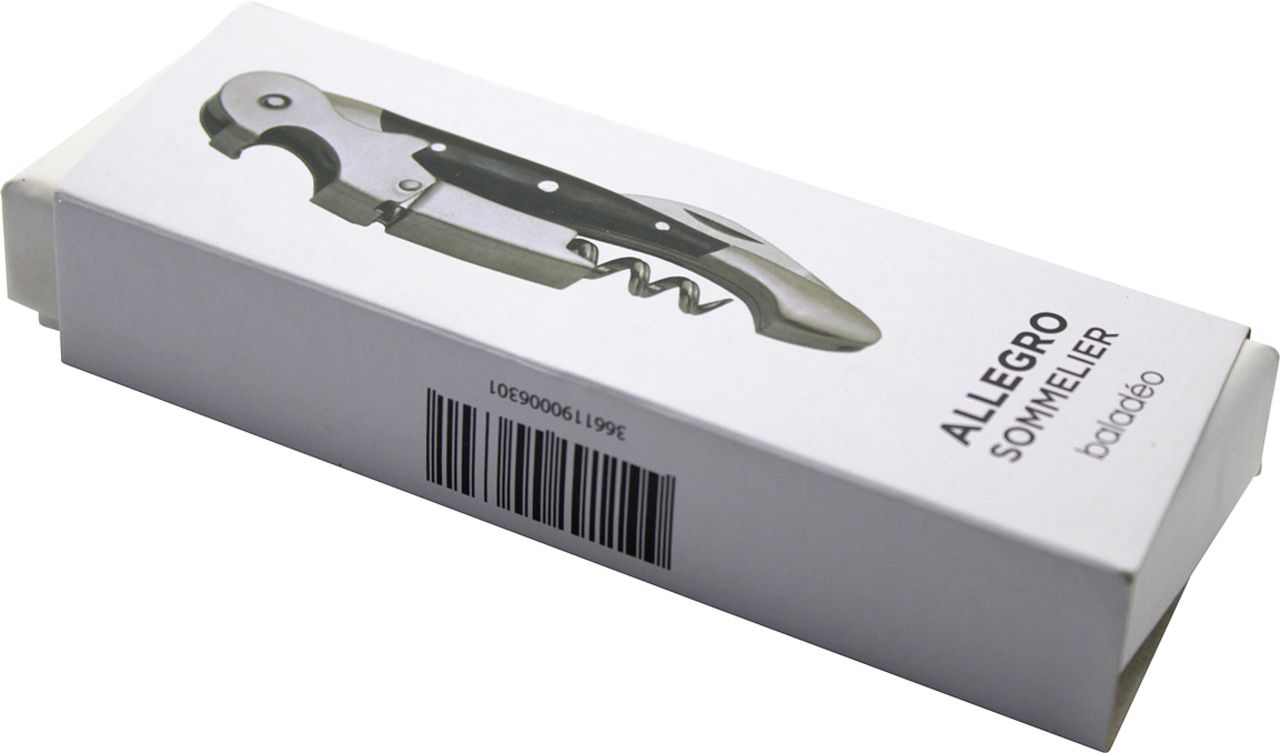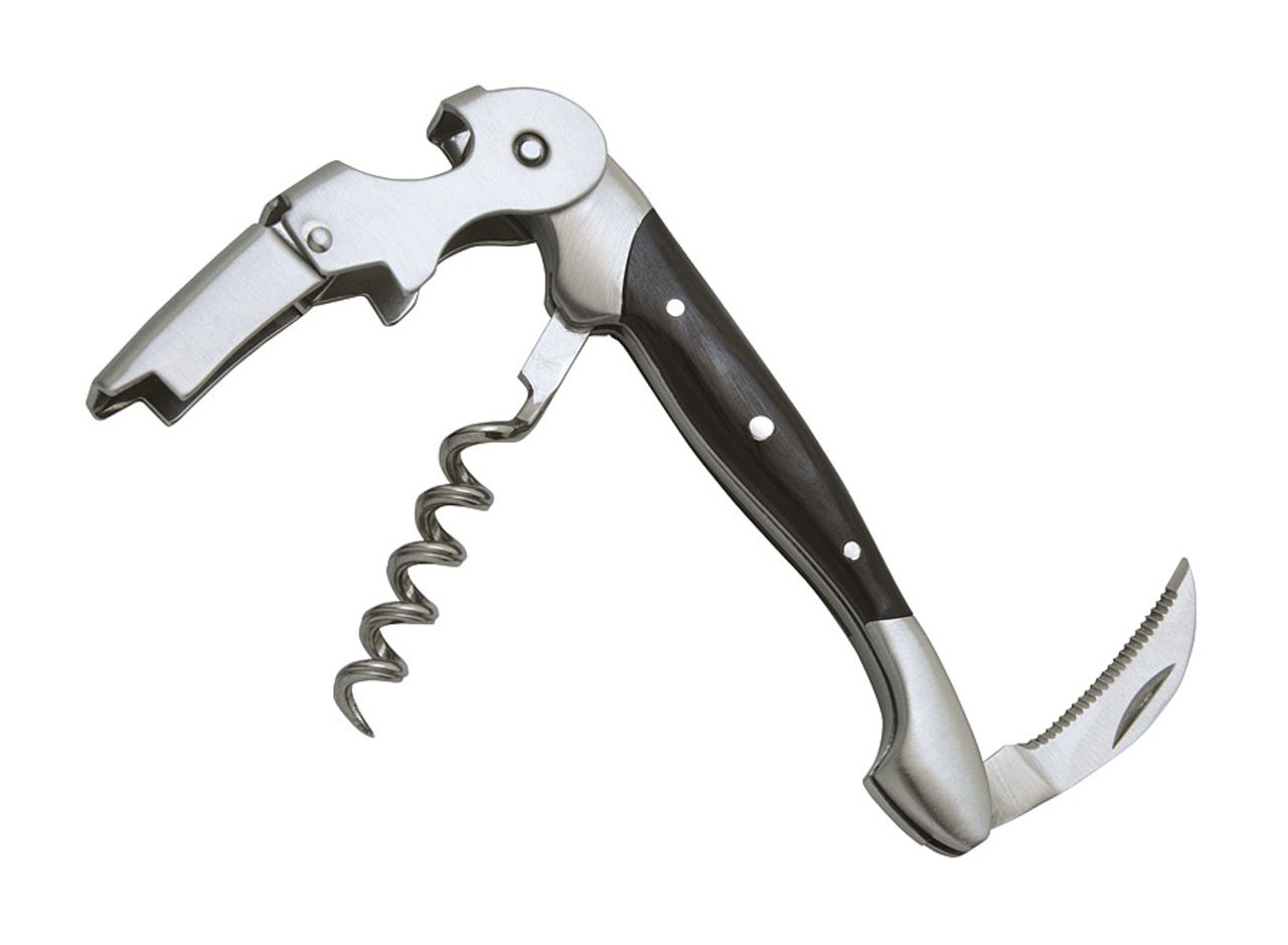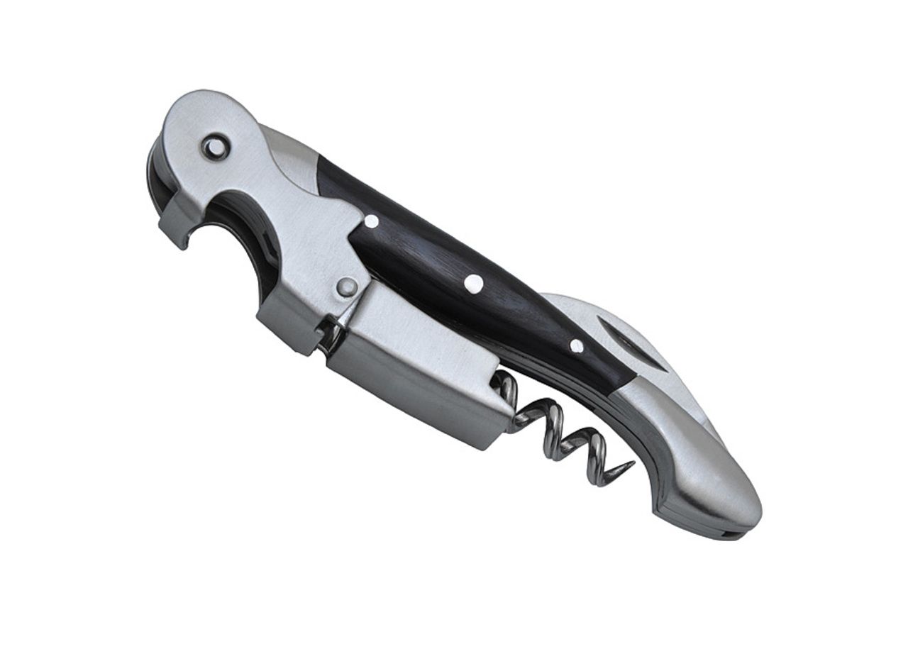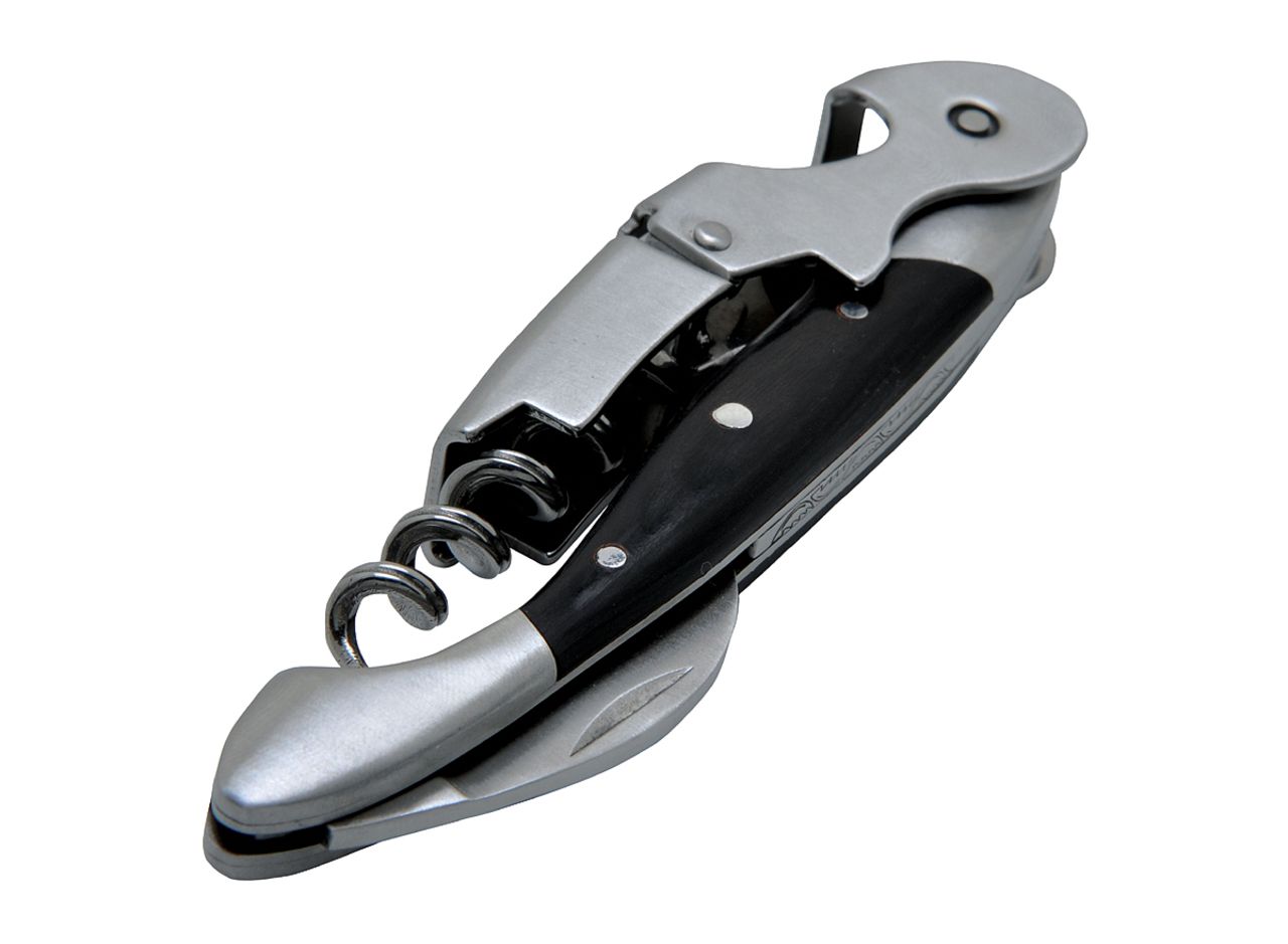 Professional two steps sommelier corkscrew. Black stamina handle with 'vine leaf' guillochage and stainless steel. 2 full stainless steel bolsters. 5 spirals stainless steel corkscrew end. Micro-serrated lid cutter. Quick bottle opener. Delivered in an gift box.