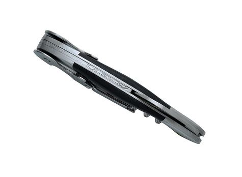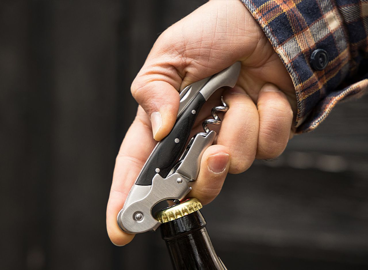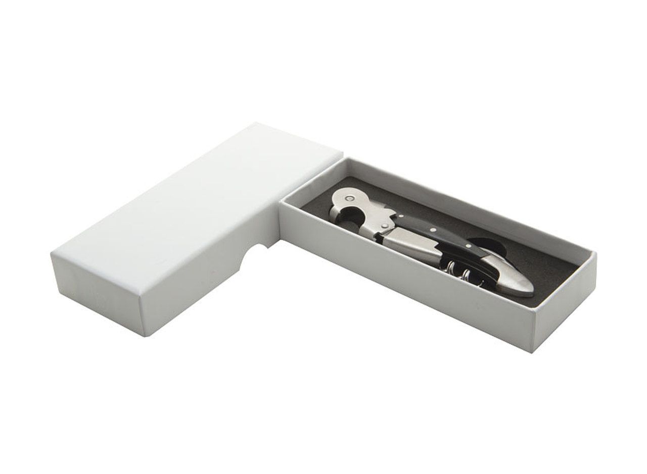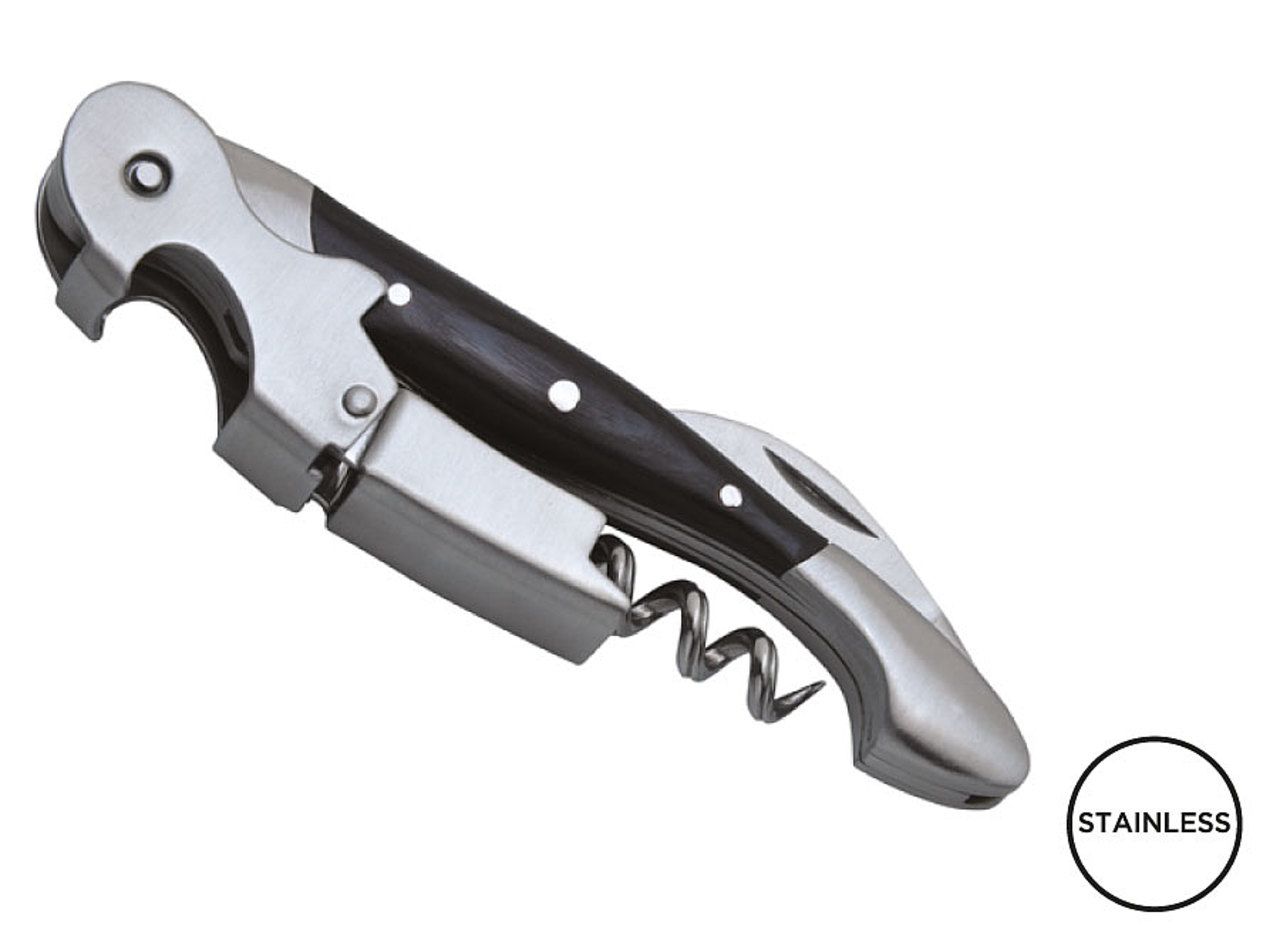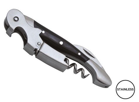 Professional two steps sommelier corkscrew. Black stamina handle with 'vine leaf' guillochage and stainless steel. 2 full stainless steel bolsters. 5 spirals stainless steel corkscrew end. Micro-serrated lid cutter. Quick bottle opener. Delivered in an gift box.