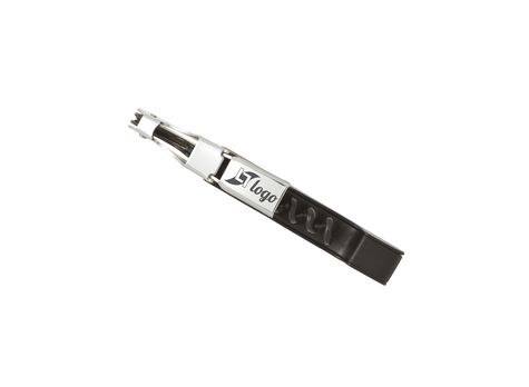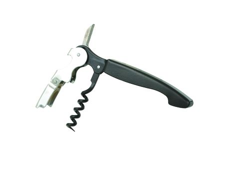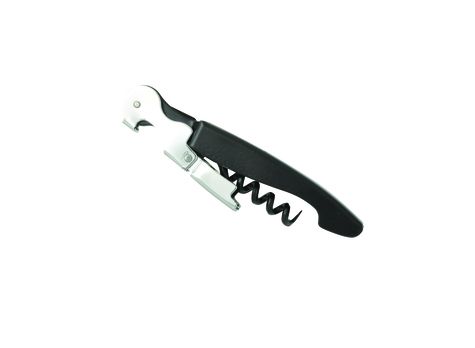 Professional two steps sommelier corkscrew. Stainless steel handle. 5 spirals stainless steel corkscrew end with a black non-stick coating. Micro-serrated lid cutter. Quick bottle opener.