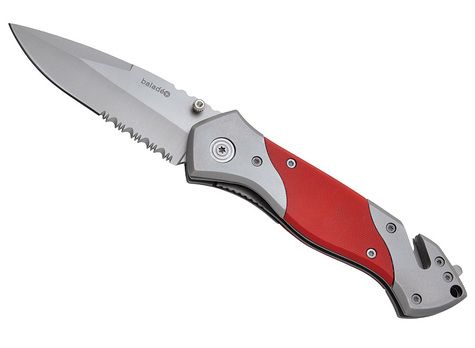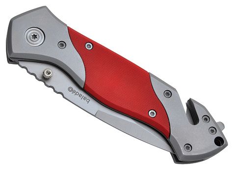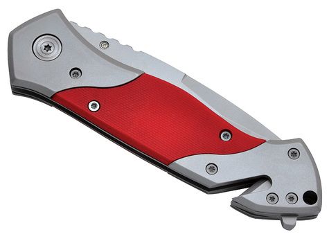 Folding pocket knife with a 420 stainless steel blade. Blade with a fine part (for precision cutting) and a micro-serrated part (for heavy duty task). Red G10 fiber and stainless steel handle. One-handed opening/closing with a Liner lock safety system. Torx screw assembly. Seat belt cutter and window breaker hammer functions at the back of the handle. Heather grey RPET pouch included.
